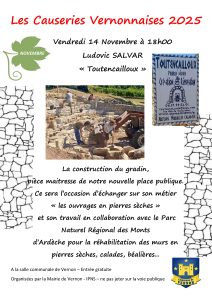 La prochaine causerie sera celle de Ludovic Salvar, entreprise “Toutencailloux” qui nous révèlera les coulisses du gradin en pierres sèches qu’il a réalisé cet été avec son équipe sur la place Champégua . Il vous exposera plus généralement son travail de réhabilitation ou de création de toutes sortes d’ouvrages en pierres sèches, permettant de pérenniser le savoir-faire ancestral de notre région.