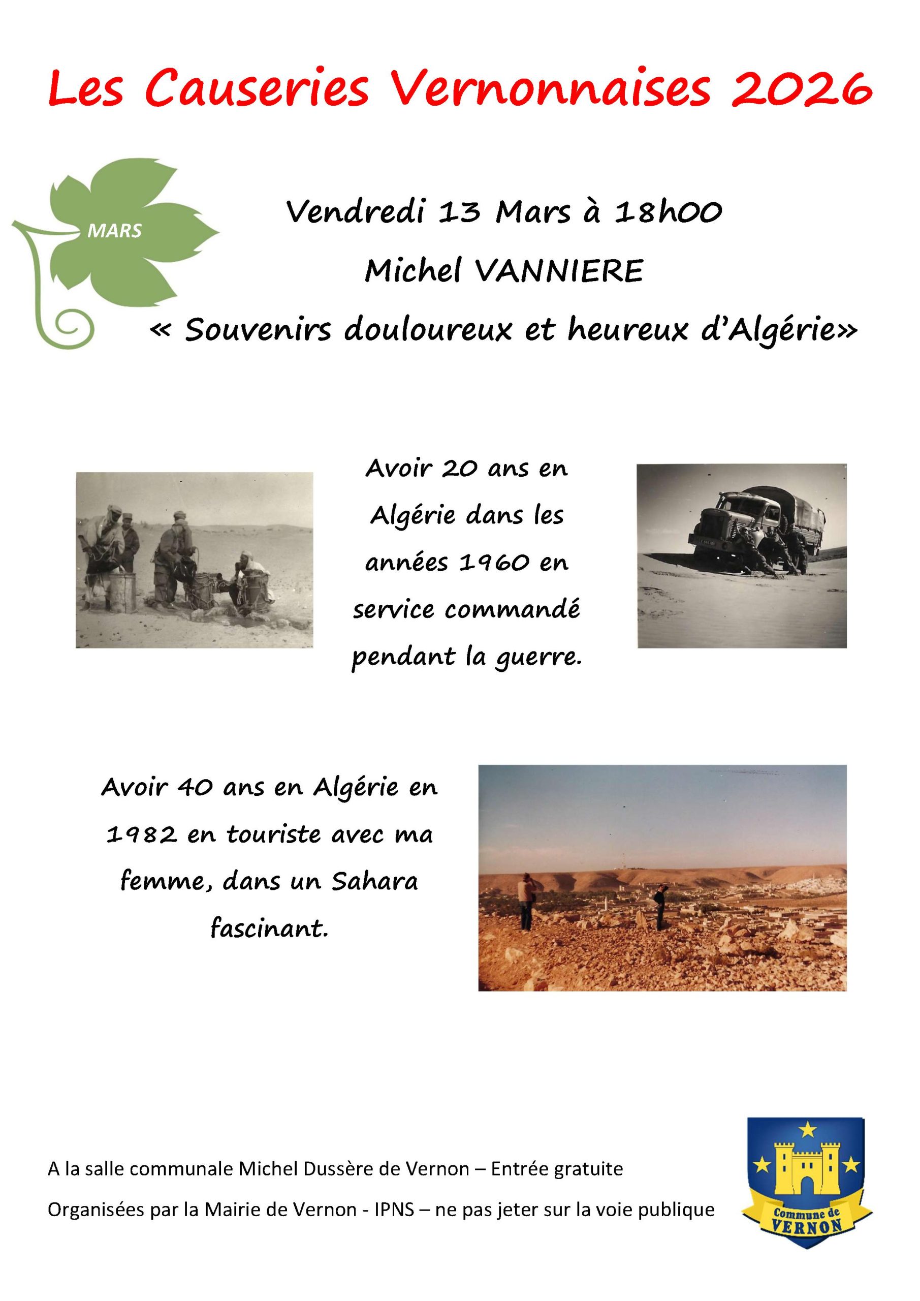 Le vendredi 13 mars à 18h à la salle communale Michel Dussère de Vernon, nous aurons le plaisir d’accueillir Michel Vannière qui nous partagera ses souvenirs d’ Algérie pendant la guerre et aussi 20 ans après…