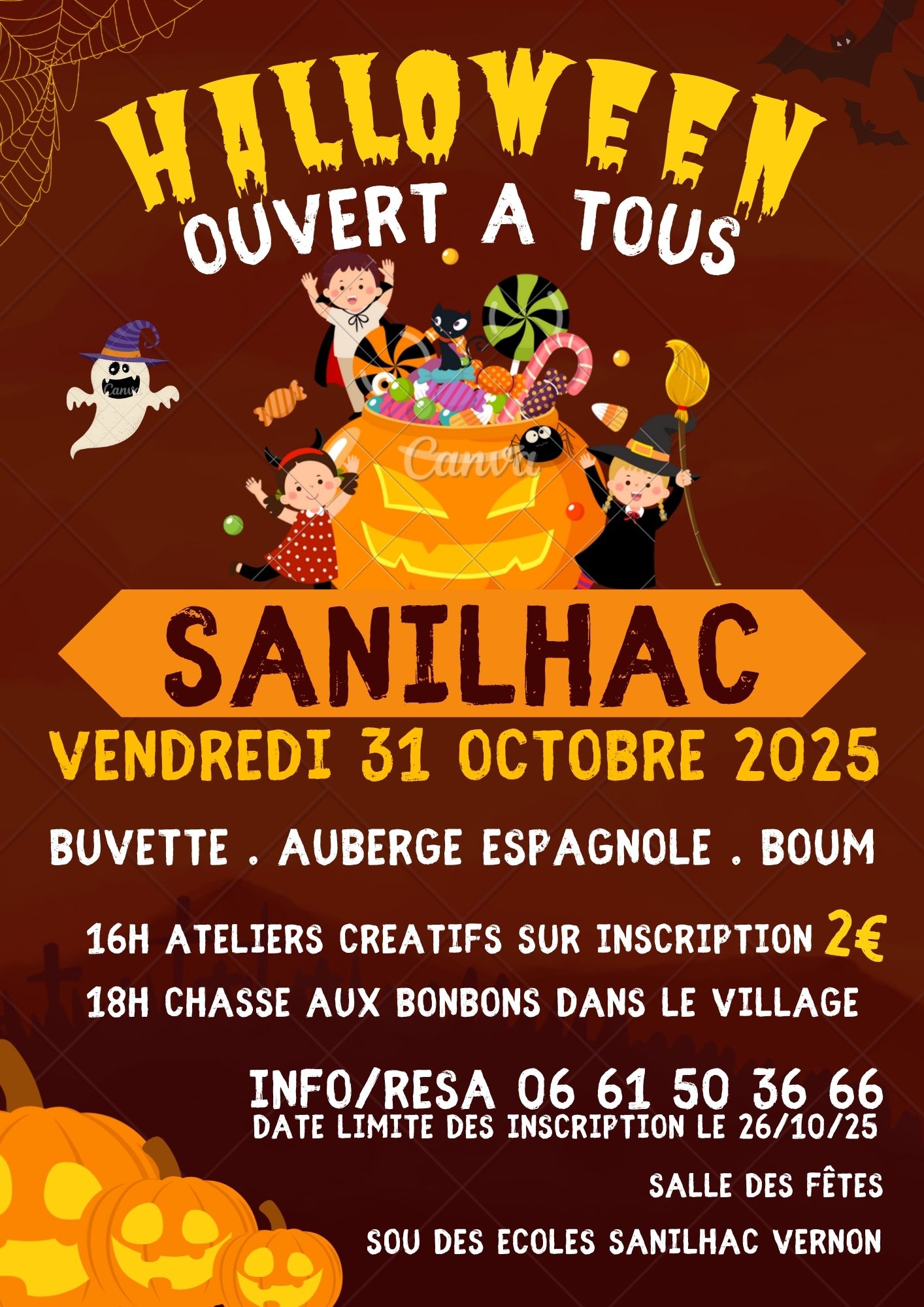 Vendredi 31 octobre : fête d’Halloween ouverte à tous à Sanilhac : ateliers créatifs dès 16h suivis d’une chasse aux bonbons dans le village à 18h – buvette