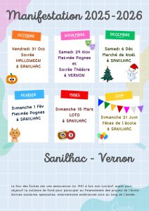 Le Sou des écoles organise plusieurs manifestations en cette fin d’année afin d’aider à financer les projets de classe des écoles de Sanilhac et Vernon :