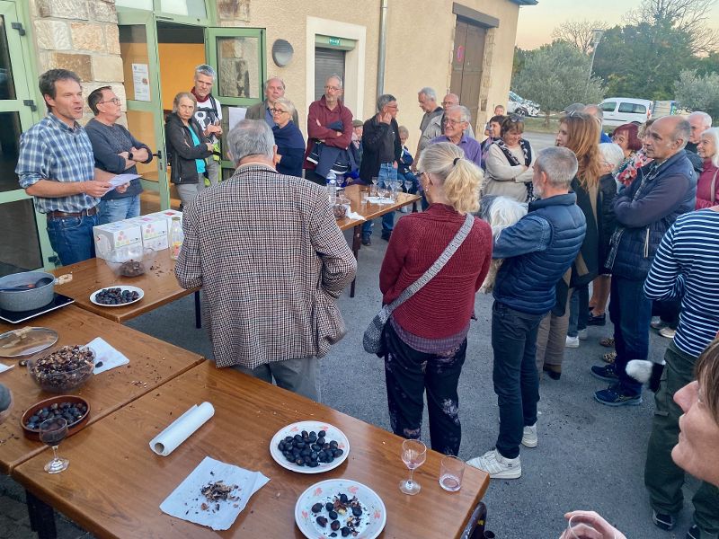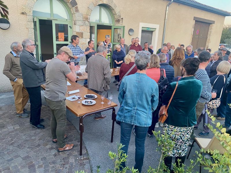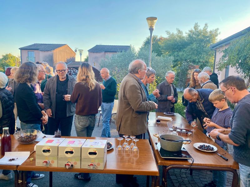 Châtaignes particulièrement goûteuses, Gamay nouveau de la cave de Rosières, vin chaud et discussions amicales…une belle soirée de partage.