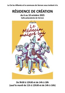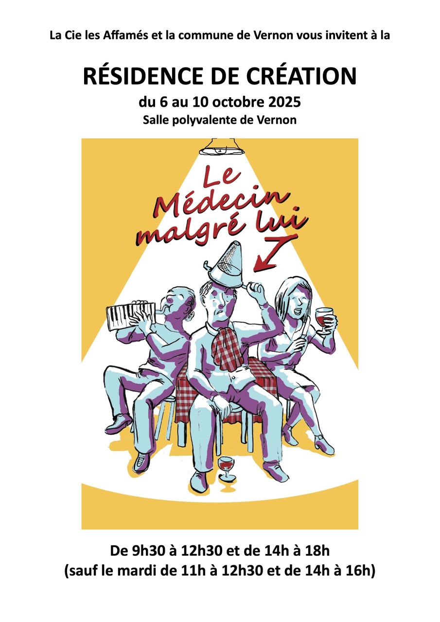 Comme chaque année la commune de Vernon soutient la création de la compagnie de théâtre « Les Affamés ». Ainsi la salle communale a accueilli en résidence pendant une semaine les comédiens : Fanny Corbasson, Gilles Droulez et Laurent Andary pour les répétitions de leur nouvelle pièce, une adaptation du « médecin malgré lui » de Molière .