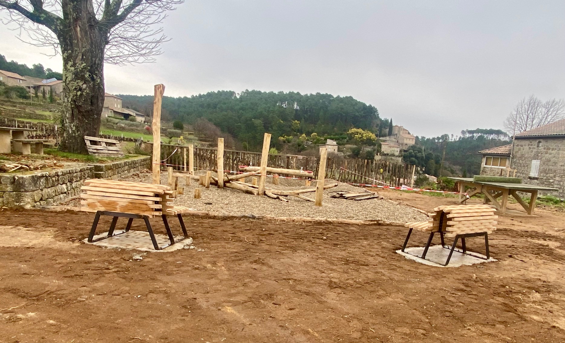 Réalisation des garde-corps en piquets de chataignier, de l’aire de jeux, du mini stade et de l’espace détente en pavés de béton récupérés de l’ancienne dalle –