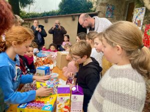 Il y en avait en vrac que nous partagé entre parents et élèves et il y avait aussi un plus gros œuf emballé pour chaque élève avec à l’intérieur d’autres petits œufs.